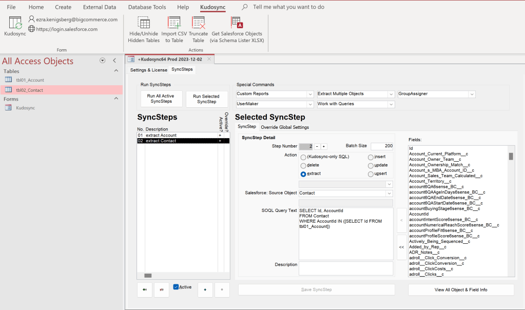 A feature I added awhile ago: the ability to combine Salesforce SOQL with Access SQL–in the example below, you can see the Contact query