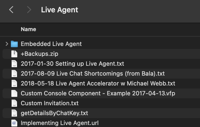 - the Visualforce file “Custom Console Component – Example 2017-04-13.vfp” has a date at its end, which captures the last time I made any meaningful revisions to it.