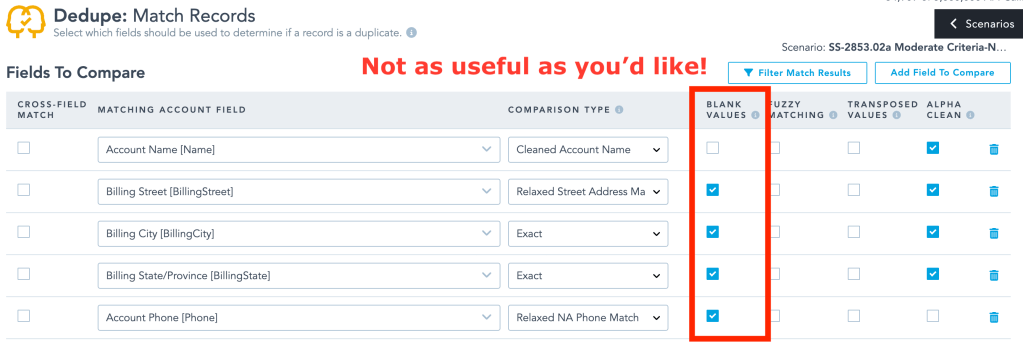 I thought DemandTools enabled merging records where you’re matching on fields like the following. No-brainer, right?