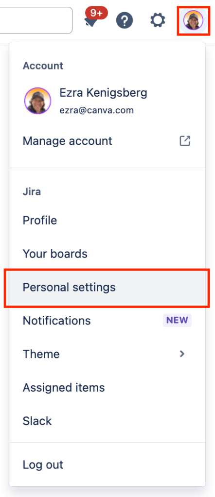 1] click your Account menu in the upper right-hand corner and choose “Personal Settings“: