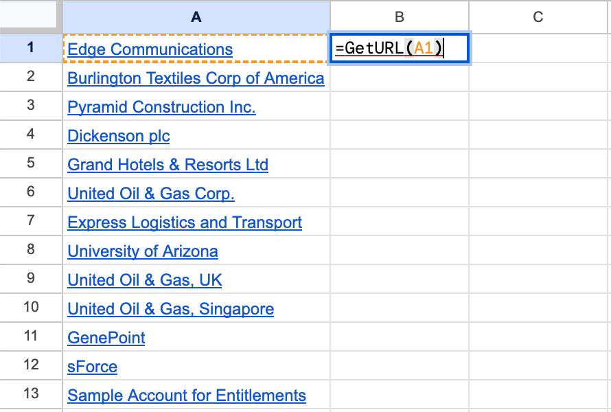 Congratulations! You now have a custom GetURL() function you can use in the spreadsheet, like this: